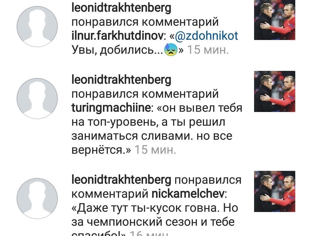 Луис Адриано «У меня нет слов, чтобы поблагодарить вас за все эти годы совместной работы. Это была гордость и привилегия. Спасибо» Зобнин «Спасибо за доверие и поддержку на протяжении всего периода работы с Вами!» Джано «Спасибо за всё» Самедов Спасибо за всё мистер. Был очень рад с Вами поработать. Надеюсь ещё увидимся. Джикия «Никогда не забуду этот день, спасибо Вам за все! Ещё увидимся...» Рассказов «Спасибо Вам, Мистер, за всё!) Удачи Вам)» Боккетти «Спасибо за все, Мистер! Удачи в будущем!» Глушаков «Хочу поблагодарить Массимо Карреру за чемпионский сезон. Именно с этим тренером мы добились долгожданного успеха в чемпионате. Уверен, что у него всё будет хорошо!» Молодцы, хули слили тренера, на поле надо было благодарить, а щас пусть эту благодарность себе в задницу засунут. -------------------- Чему бы грабли не учили , а сердце верит в чудеса.