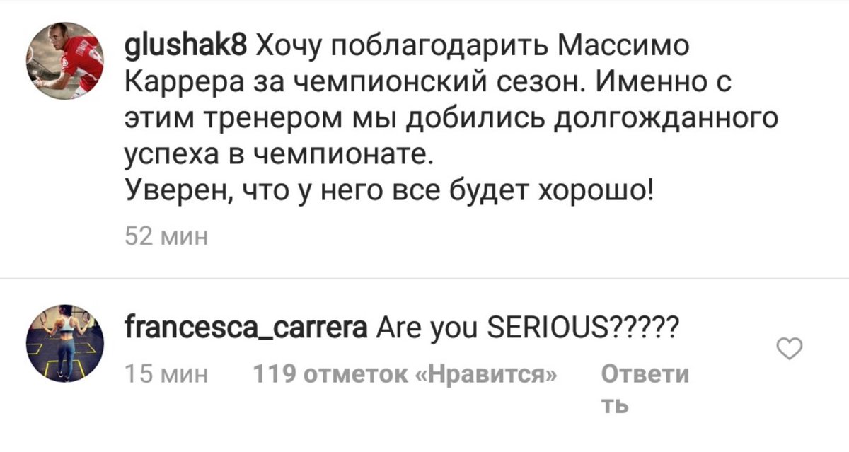 Луис Адриано «У меня нет слов, чтобы поблагодарить вас за все эти годы совместной работы. Это была гордость и привилегия. Спасибо» Зобнин «Спасибо за доверие и поддержку на протяжении всего периода работы с Вами!» Джано «Спасибо за всё» Самедов Спасибо за всё мистер. Был очень рад с Вами поработать. Надеюсь ещё увидимся. Джикия «Никогда не забуду этот день, спасибо Вам за все! Ещё увидимся...» Рассказов «Спасибо Вам, Мистер, за всё!) Удачи Вам)» Боккетти «Спасибо за все, Мистер! Удачи в будущем!» Глушаков «Хочу поблагодарить Массимо Карреру за чемпионский сезон. Именно с этим тренером мы добились долгожданного успеха в чемпионате. Уверен, что у него всё будет хорошо!» ![]() Ну конечно, поверим обиженным итальянским курам))) Как в свое время тут многие раскудахтались насчет бреда от Гаврилова... Вы серьезно?))) -------------------- Видел, слышал, читал...