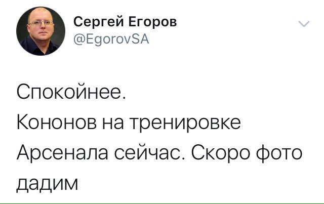 Вот что написано в твиттере - "С Кононовым договорились. Осталось только решить вопрос с Арсеналом. Поздравляю вас, дорогие друзья, с очередным дном ноу неймом, с очередным шестым местом и вылетом из ЛЕ и КР. А с ходу посреди сезона много кого лучше можно найти?) -------------------- И Карпин великий нам путь озарил...