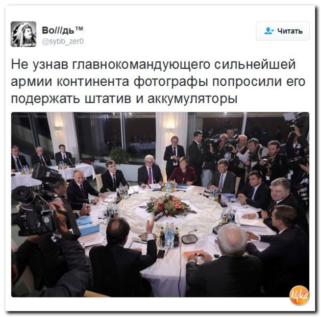 Цитата «Закончились переговоры в Нормандском формате. Выходит Порошенко. Президент страны, в которой погибли тысячи людей. Дети. Люди остались без дома, вынуждены были переселяться или же продолжают жить под обстрелами без элементарных удобств. Выходит их президент, который должен решить, когда закончится война, и говорит, что у него есть плохая новость: проиграло «Динамо». Когда ты дебил и твои дети учатся в Англии — в принципе, смешно». ![]() Вот так должен выглядеть нормандский формат... |