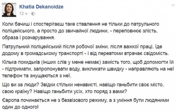 Она переутомилась на работе, — глава Нацполиции Украины выгораживает «упоротую патрульную» ![]() Глава Нацполиции Хатия Деканоидзе утверждает, что неадекватная сотрудница правоохранительных органов не находилась в состоянии наркотического или алкогольного опьянения в момент съемки нашумевшего видео, а просто «теряла сознание от переутомления на работе». Об этом глава Нацполиции Украины написала на своей странице в Facebook. «Патрульный полицейский после рабочей смены, после тяжелого труда едет домой в общественном транспорте и от переутомления теряет сознание. Несколько подонков (других слов у меня нет) вместо того, чтобы помочь ей — поддержать, предложить воду, вызвать скорую, — направляют на нее телефон и издеваются над ней», — написала Деканоидзе, не уточнив происхождение видео. «Что вы за люди? Откуда столько ненависти, зачем позорить свой город, свою страну? Зачем позорить всех, кто рядом с вами?» — восклицает Деканоидзе, явно намекая на то, что страну и всех, кто рядом, позорят те, кто сняли и выложили видео в Сеть, а вовсе не сотрудница правоохранительных органов, имеющая табельное оружие и право применять силу. -------------------- "Судьба у меня в руках, и счастье всегда со мной!"