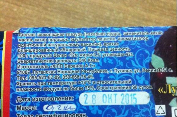 ![]() В магазине на Бессарабской площади в Киеве можно купить торты из Луганска. Об этом сообщают украинские СМИ. На этикетке торта «Луганский» указан адрес производителя — Луганская народная республика, город Луганск. Этот факт шокировал «свидомых» украинцев. «Это п…ц!», «Если СБУ не найдёт поставщика и все цепочки в этой схеме, то накормить этими тортами главу СБУ», «Ох…ть. Как у нас всё покупается и продаётся», — комментируют они опубликованные фото.