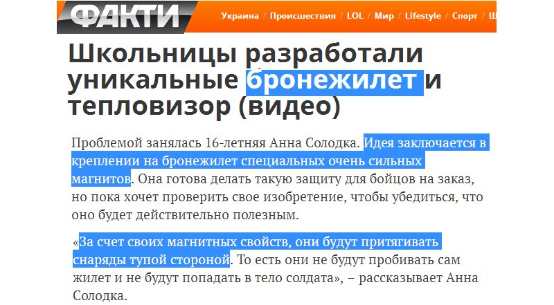 Там школьник ещё танк изобрёл, убийцу Арматы, из картонных коробок слепил. Получи, ватник! ![]() "Особенность этой каски в том, что поверхность – рельефная, в виде маленьких пирамидок, – по-взрослому рассказывает Павел. – Поэтому пули или осколки попадают на каску под углом и отражаются, а не пробивают. Это происходит благодаря тому, что уменьшается энергия и импульс пули, поэтому та и рикошетит. А сама каска, как и обычная, из металла". -------------------- |
