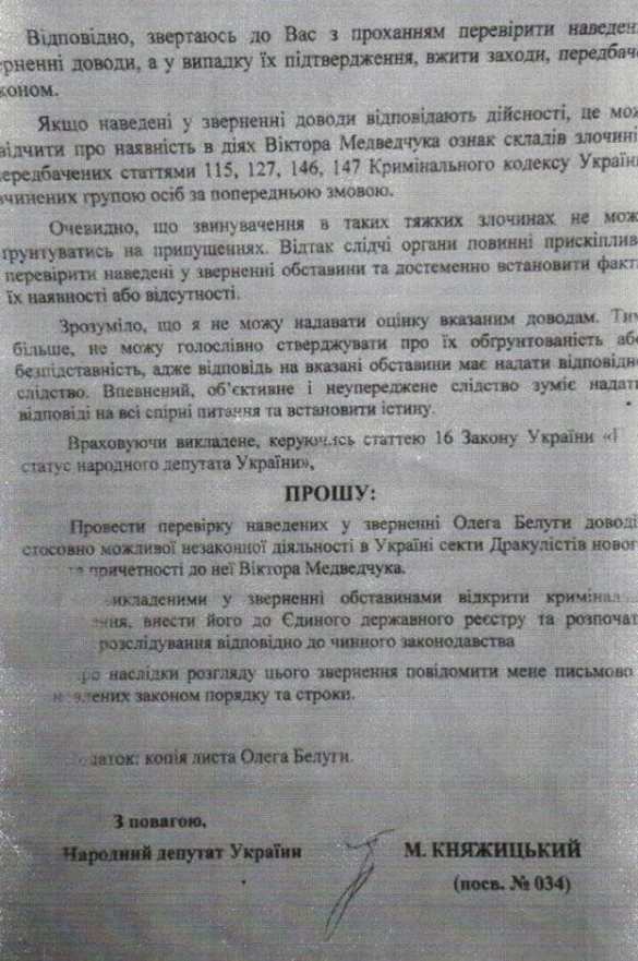 Депутат украинского парламента Николай Княжицкий намерен расследовать деятельность «секты дракулистов», якобы возглавляемых Виктором Медведчуком. Об этом сообщил запорожский бизнесмен Кирилл Тютюнник. «Когда вы это прочтёте, то поймёте, чем занимаются некоторые депутаты. Какой законодательной деятельностью. Есть такой очень унылый и грустный тип Княжицкий. Блин. Я пишу и сам не верю в это. Аваков там ещё пост о вампирах не публиковал? Короче. В прошлом глава редакционного совета телеканала ТВі, руководитель медийных компаний и телеканалов Tonis, СТБ, УТ-1, „Газеты 24”, а ныне председатель Комитета ВР по вопросам культуры и духовности(!) Николай Княжицкий вот что отмочил. Как депутат ВР он направил депутатское обращение к министру внутренних дел Украины Арсену Авакову. Это не фейк, сам Княжицкий в своем ФБ не стал отрицать, что подписал и отправил обращение на своем депутатском бланке. Суть обращения Княжицкого заключается в следующем: Цитата Княжицкий, ссылаясь на некого Олега Белугу, просит Авакова расследовать деятельность „секты Дракулистов нового времени”, „культовым служителем” которой якобы является Виктор Медведчук. Как вам? Это депутат пишет. Один из спикеров „партии войны”, на секундочку! Приложивший руку ко всем событиям, которые сегодня переживает наша страна, включая войну на Донбассе. Друзья, не поленитесь и прочтите обращение этого деятеля к Авакову. Что с ним такое? Наркотики? Галлюциногенные грибы? Цитата Вы понимаете, кто сегодня заседает в нашей Верховной Раде? Каких реформ можно ждать от этих людей!? Очередное дно пробито. До сих пор не могу поверить, что такое может быть. А Княжицкий даже пост в fb этому посвятил. Вы понимаете? Люди из „партии войны” развязали войну, разрушили экономику, буквально распродают страну, установили такие тарифы, что я не представляю, как некоторые люди выживают Цитата … А эти отъявленные мерзавцы за деньги налогоплательщиков чуть ли сатанинские обряды проводят. Вместо того чтобы работать и страну поднимать. В то время, когда бабушка из Запорожья обращается к Руслане за помощью установить солнечные батареи, чтобы не зависеть от грабительских цен на газ, такие подонки, как Княжицкий, на полном серьезе отвлекают МВД от прямых обязанностей и требуют ловить вампиров. Цитата Эй, кто там в Киеве, позвоните в больницу Павлова или в Глеваху! Пускай скорее машину в ВР высылают». ![]() ![]()