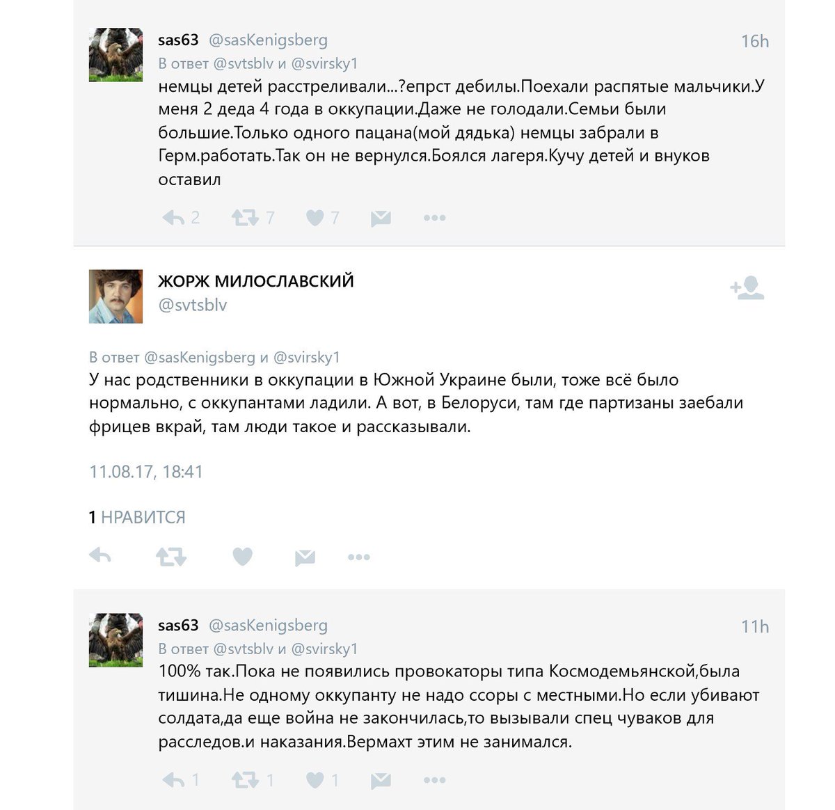 ну если опираться на логику, а не на пропаганду то скорее так оно и было, это из Берлина легко требовать уничтожать население, на местах эти директивы армия спускала на тормозах, ей безопасней не озлоблять лишний раз население. Впрочем были случае что некоторых садистов отправляли в концлагерь за зверства, были ли такие случаи когда работничков нквд отправляли в лагерь за их зверства? Бабушке моей расскажи, оккупацию пережившей... Или прадеду моему, немцами расстрелянному... Как можно такую чушь нести? Легко))) Первый раз чтоли) -------------------- Терпеть. Работать. Победить.
