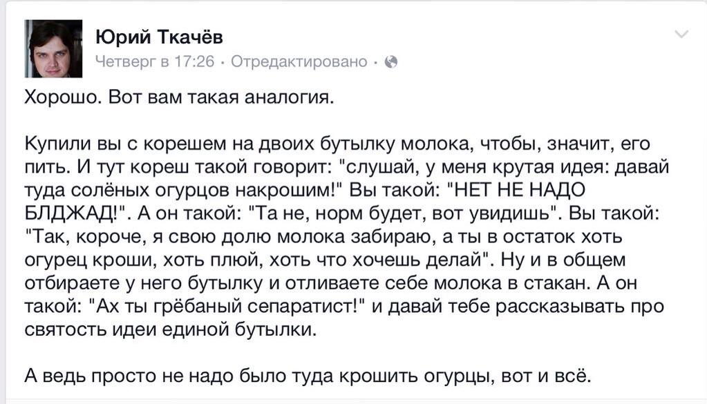 Ростовское управление ФСБ России заявило о переходе более 40 украинских военнослужащих на российскую территорию. «Около 20.30 субботы 41 украинский военнослужащий оставил свои воинские части и прибыл на украинский пункт пропуска «Изварино». Они обратились к ополченцам с просьбой оказать им помощь при переходе на территорию России в связи с тем, что они не желают воевать против собственного народа», – цитирует РИА «Новости» заявление руководителя пресс-службы ведомства Василия Малаева. Он добавил, что все украинские военнослужащие уже перешли на территорию России через пункт пропуска «Донецк». Военные выразили благодарность ополченцам, которые помогли им беспрепятственно перейти границу, и пожали им руки. http://nnr.su/32962 Предатели, америка же с ними, да Дуст? Та эта путинская пропаганда... Ага наверн скрытно в трусах пронесли украинскую жовто-блакитную тряпку и потом тайно её водрузили на 1248 дереве в лесу.)))) |