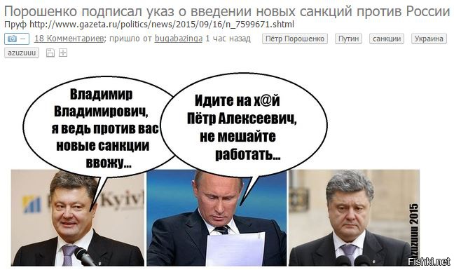 Порошенко расширил санкции против России Президент Украины Петр Порошенко подписал указ о расширении санкций в отношении России. Ранее в среду украинский лидер призвал к усилению санкций международное сообщество О подписанном указе, расширяющем санкционный список физических и юридических лиц сообщает пресс-секретарь Порошенко Святослав Цеголко, который разместил у себя фото документа. Новых фигурантов санкционного списка Киев пока не называет. Сегодня, как сообщает пресс-служба украинского президента, Порошенко на встрече с членами комитета по политики и безопасности ЕС заявил, что в список войдут более 400 физических и более 90 юридических лиц. Он отметил, что решение принималось «в четкой координации с нашими партнерами из Евросоюза и США». Указ вводит в силу решение Совета национальной безопасности и обороны Украины от 2 сентября. Тогда СНБО назвал расширение санкционного списка «необходимостью эффективного реагирования на продолжающуюся вооруженную агрессию России против Украины». Украина ввела санкции в отношении России в сентябре 2014 года. Санкции предполагали запрет на вывод капитала с территории Украины для российских граждан, запрет для российских компаний на участие в приватизации, запрет на экспорт в Россию товаров военного назначения и двойного назначения. Кроме того, в августе Киев утвердил расширенный санкционный список граждан и компаний, в который вошли 1124 физических лица и 156 компаний. Подробнее на РБК: http://top.rbc.ru/politics/16/09/2015/55f9...a79472c9bf480ba