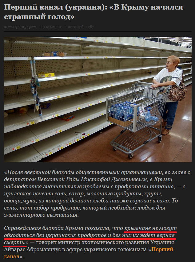 Такие же прилавки и на Кубани теперь наверное... Вчера у Шустера эти стратеги утверждали, что половина поставок идет через Керчь на Кубань))) Я неделю как с Кубани... Побывал в Анапе, витязево, тамани, славянске на Кубани ... Ехали на море как раз по трассе с портом Кавказ... Кучу фур не видел. На Кубани всего своего завались... Цены намного ниже, чем у нас помидоры сейчас 35-40 руб, у нас 80-100, хлеб вкуснейший 21 руб, у нас 28. Родителям привозит молоко домой дядька, трехлитровый баллон 70 руб. Яблоки местные 30-40 р, у нас местные 70-100. Сам не люблю Ткачева, но продукты с его Выселок... Мясомолочные очень высокого качества и цены очень привлекательные. Кстати выбор намного больше, чем у нас здесь. А вернулся назад в Подмосковье и опять все тоже самое и все дорогое. |