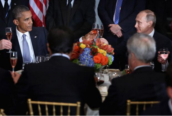 ![]() Ведущая украинская телестудия ТСН опубликовала сюжет, в котором Президент США проигнорировал бокал Российского Президента. «Президент США Барак Обама после провозглашения тоста на ланче в ООН не чокнулся бокалом с президентом России Владимиром Путиным. Когда Обама сказал тост с трибуны, он пошел с бокалом на свое место за столом, чокнулся с генскеом ООН Пан Ги Муном и некоторыми другими политиками, но проигнорировал российского президента. На видео видно, что Путин с бокалом хотел встать со стула, чтобы чокнуться с Обамой, однако вовремя остановился». Между тем в тысячах телевизионных сюжетов и фотографий видно, как Пан Ги Мун специально встал, чтобы дать возможность соприкоснуться кубками Путину и Обаме.
