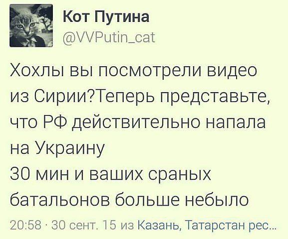 Яценюк ведёт войну с ядерной державой и считает, что Россия заберет не только Донбасс, но и Украину | Русская весна Об этом премьер-министр Украинского Государства заявил во время своего визита в Черновцы. «Украина воюет с Российской Федерацией, которая является ядерной державой. И, к сожалению, до завершения этой войны очень и очень далеко», — заявил Яценюк. По его словам, Россия не желает выполнять Минские соглашения и делает все для того, чтобы затянуть процесс. «Незаконная аннексия Крыма, захват Донецка и Луганска, Минский процесс — который пока процесс, а не результат — не дают большой уверенности в том, что завтра в Украине наступит мир и российские войска отступят», — подчеркнул Яценюк. «Считаю, что Россия не желает выполнять минские соглашения и делает все для того, чтобы затянуть процесс и выиграть время. Основная цель Российской Федерации — это не Донецк и Луганск, а вся Украина. Эта цель не изменилась», — подчеркнул глава правительства Украинского Государства. -------------------- "Судьба у меня в руках, и счастье всегда со мной!"