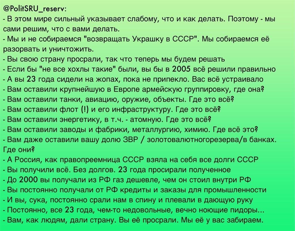 ну просто не вписывается у некоторых в систему координат даже гипотетическая возможность наличия у человека бескорыстного желания помочь жителям Донбасса отстоять свою землю и своих близких... В голову тех, у кого культ айфона, такое даже придти не может Ясен хуй! В моём понимании таких добровольных дебилов не существует! Только вопрос допускающим бескорыстное помогание - а чо сами допускатели с данного форума, они тока высокопарную хуйню писать могут про помощь в отстаивании своей земли жителями Донбасса, почему сами не помогают? Свою трусость скрывают наездами на тех, у кого якобы в голове культ Айфона?! Тока не надо про борьбу с Путеным писать! Я уже отвечал! Чо, патриоты - жим-жим? В арсенали тока сказочки про мифических отпускников? а у тебя очко не жим жим приехать на Болотную и тут поскакать Путин ла-ла-ла? или только в интернете ты герой борец против путинского беспредела? прежде чем хуйню писать, в зеркало посмотрись ещё интересно, что про жим жим ты мне пишешь, прошедшему Фергану, Абхазию и Чечню -------------------- "Если бы вы знали, как редко нас понимают правильно, вы бы чаще молчали." (Гёте)