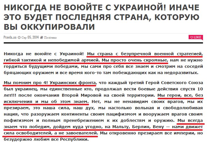 В интервью корреспонденту CBS Стиву Крофту президент США Барак Обама дал весьма красноречивую оценку положению дел, складывающихся в Украине. Известный американский журналист Стив Крофт за последнее время дважды встречался с Бараком Обамой, где задавал президенту весьма неудобные и острые вопросы. Во время второй встречи один из вопросов касался положения дел, складывающихся в Украине. Вопрос Крофта звучал буквально так: «Господин Президент, как вы оцениваете то, что после вмешательства США Украина за неполных два года, являясь довольно стабильной и успешной страной, достигла уровня слаборазвитых африканских стран, а по некоторым параметрам опустилась еще ниже?». На вопрос журналиста Барак Обама ответил, что «Соединенные Штаты делали все возможное, чтобы сценарий развития Украины имел положительный вектор. Негативные тенденции в этой стране даже не связаны с соседством России и влиянием ее политики на развитие этого государства, — все дело в том, что Украина является ярким примером страны, когда власть в ней получили полные идиоты. В связи с этим, сейчас проводится целенаправленная работа по корректированию внешней политики США по отношению к этому государству. Мы признаем некоторые ошибки и готовимся их исправить, — американцы умеют критично оценивать не только деятельность других государств, но и своего собственного.» - В чем заключается идиотизм украинской власти господин Президент? - уточнил Стив Крофт. - Во всем. Я не доверил бы им (укр. власти — прим.) даже чистить лужайку от моего Бо (президентская собака — прим.) - ответил Барак Обама. фэйк -------------------- |