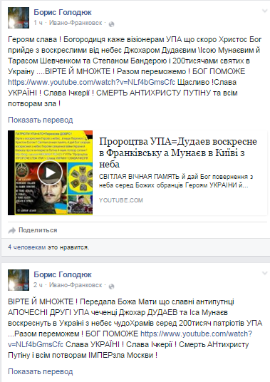 В пучине мракобесия: на Украине распространяются лжепророчества о скором конце света и явлении с небес Джохара Дудаева и Исы Мунаева в Ивано-Франковске, а Шевченко с Бандерой — в Киеве (ВИДЕО) | Русская весна Печально наблюдать, как некогда развитое общество с высочайшим уровнем инженерной культуры и технической мысли, обладавшее вторым по значению республиканским потенциалом в СССР, скатывается все глубже и глубже в примитивную, мрачную архаику с обязательными атрибутами средневековья: лжепророками и кликушами. В украинском сегменте соцсетей активно распространяются информация и видеоролик, из которых следует, что Украину в самое ближайшее время ожидает конец света, на котором с небес сойдут Джохар Дудаев, убитый под Дебальцево террорист Иса Мунаев (оба — почему-то в Ивано-Франковске), Тарас Шевченко и Степан Бандера, а вместе с ними — 200 тысяч бойцов «Украинской Повстанческой Армии» (УПА), которые свергнут режим Путина. Об этом явлении «богородица» поведала неким «визионерам УПА» (лексика сохранена) Цитата «Героям слава! Богородица говорит визионерам УПА что скоро Христос Бог придет с воскресшими с небес Джохаром Дудаевым\Исой Мунаев и Тарасом Шевченко и Степаном Бандерой и 200 тысяч святых В УКРАИНЕ…. ВЕРЬТЕ И распространяйте! Вместе победим!». или Цитата «ВЕРЬТЕ И РАСПРОСТРАНЯЙТЕ! Передала Богородица что славные антипутнцы из второй УПА чеченцы Джохар Дудаев и Мунаев воскреснут в Украини с небес, чудо в Храме среди 200 тысяч патриотов УПА… Вместе победим! Слава УКРАИНЕ! Слава Ичкерии! Смерть антихристу Путину и всем чудовищам ИМПЕРзла Москвы!». ![]() Этот горячечный бред адептов Украинского Государства едва ли заслуживал бы внимания, если бы не активное его распространение в сети и даже снятый «свидетелями явления Джохара в Ивано-Франковске» видеоролик, который мы и представляем вашему вниманию. https://www.youtube.com/watch?v=NLf4bGmsCfc -------------------- "Судьба у меня в руках, и счастье всегда со мной!"