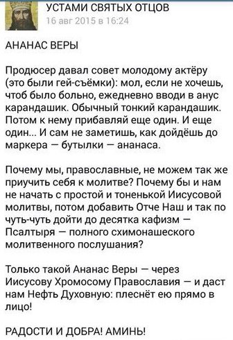 Религия реально убедила людей, что на небе живёт невидимый мужик, который следит за всем, что вы делаете, каждый день и каждую минуту. И у невидимого мужика есть особый список из десяти вещей, которые он не хочет, чтобы вы делали. И если вы сделаете любую их этих десяти вещей, у него подготовлено особое место, полное огня и дыма и пламени и пыток и страданий, куда он сошлёт вас жить и мучиться и гореть и задыхаться и плакать до скончания веков! И при этом Он любит вас. Он любит вас — и ему нужны деньги! Ему всегда нужны деньги! Он всемогущий, всесовершенный, всезнающий и наимудрейший, но он каким-то образом не умеет зарабатывать деньги! Религия получает миллиарды долларов, они не платят налогов, и им всегда нужно ещё чуть-чуть. © Джордж Карлин Карлин мудак, если убежден что его заставляют носить деньги Богу. Ладно когда крестики, цепочки и свечи продают. Это материальные ценности, это понятно. Непонятно почему такие обряды как крещение, отпевание, освящение, венчание стоят денег. А ведь без них якобы нельзя. Я в принципе не против. Это личное дело каждого куда ему отдавать свои деньги. Священнику, психологу или сэкономить. Но мы имеем факт. Церковь на вере зарабатывает. И зарабатывает неплохо. -------------------- Терпеть. Работать. Победить.