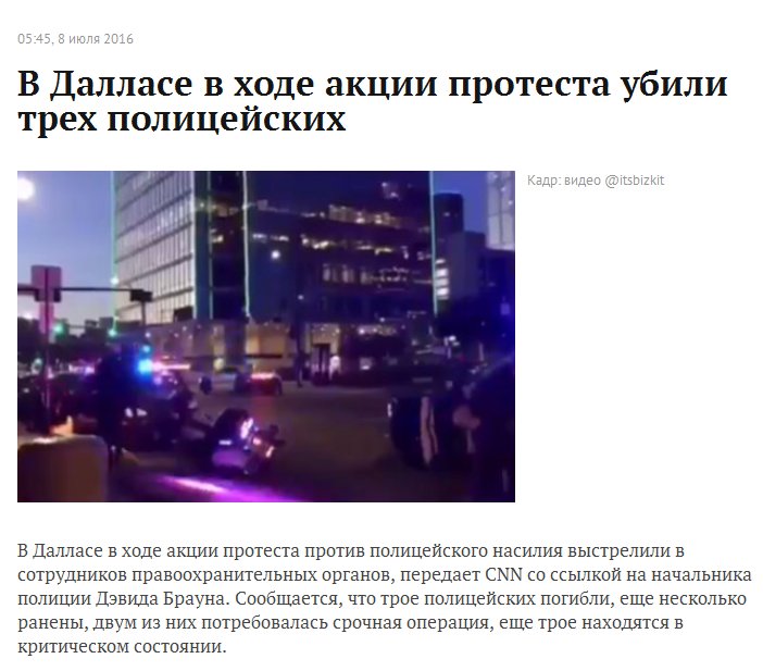 Ты нам тут постоянно рассказывал какая в СШП правильная и замечательная полиция. А чего столько простых американцев объявили настоящую охоту на полицейских? Им что методички забыли дать почитать? |