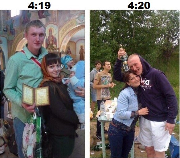 Самое забавное, ладно бы духовность возрождалась у народонаселения пропорционально строящимся церквям и прочим религиозным сооружениям, а то ведь хуй там. По моим ощущениям только деградация идёт. Тоже думаю, что не влияет. Зачастую получается, как на этих фото: ![]() никакой связи, на Руси всегда пили и в церковь ходили -------------------- "Если бы вы знали, как редко нас понимают правильно, вы бы чаще молчали." (Гёте)