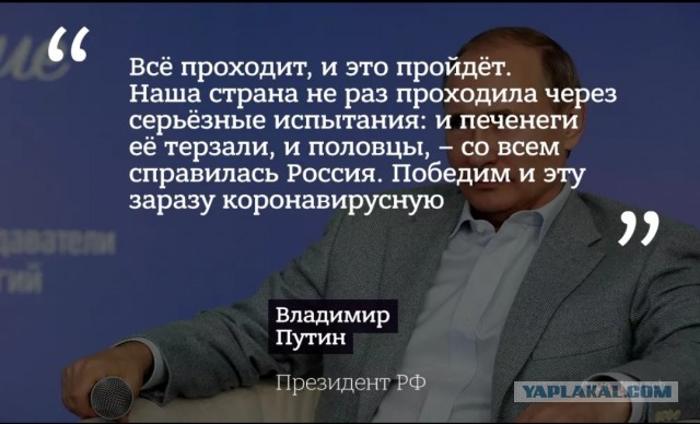 Как Вам выступление Путина? Куча шуток про печенегов и половцев в нете очень развлекают. Молодец Володя - скрасил самоизоляцию. Ну вот. Про печенегов что то я не слышал правда да и шуток тоже вроде "Все проходит, и это пройдет. Наша страна не раз проходила через серьезные испытания: и печенеги ее терзали, и половцы, - со всем справилась Россия", - отметил глава государства в среду в ходе видеоселектора с главами регионов. Так половцы и печенеги граждане России. А наша страна не для них? Какая то странная шутка. А может это не шутка была поэтому я её и не услышал. -------------------- БАБАЙ Оскорбление юзера - 7 дней
