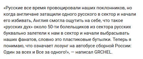 Англичане мрази, терроризировали всю Европу не одно десятилетие. А тут наткнулись на тех, кто их впервые отлупил как следует. Так им и надо. Так они вместо того, чтобы как уважающие себя мужики прониклись бы к нам за это уважением, стали ныть и плакать, как их бедных и несчастных обижают. Бабы настоящие, могут бить тех, кого считают слабее себя. Ну не плачьте, признайте поражение своё и всё. Как мужики делают. А то ж превосходящей в несколько раз толпой нападать это нормально, а как потом этой толпой позорно бежать от горстки наших так это сразу слёзы и сопли. Пусть боятся, суки. Пусть знают кого нельзя трогать. Наши немцев до Берлина гнали, а эту пьяную быдлятину тем более. И пусть знают и боятся что их ждёт через 2 года. Чтобы здесь на нашей земле ни одной витрины не разбили, суки. Помню финал Лиги чемпионов 2008 когда Москву наводили фанаты сразу двух команд. Пели песни, пили пиво, тусовались и веселились. Ни драк, ни стычек, ни погромов. Вот пусть так оно и будет, приезжают пусть мирно, а эти погромы пусть из головы выкинут пока в России. И к российским болельщикам пусть даже не думают подходить. Наши первые не нападут. Но если тронешь, то огребёшь по полной. Это надо знать. -------------------- ¡Vive hoy como si fuera tu ultimo dia, porque un dia de estos puede serlo!