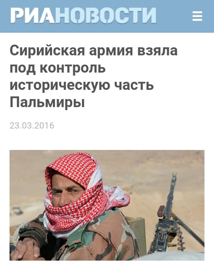 Офицер российских сил специальных операций погиб в Сирии во время выполнения задачи по наведению авиаударов по террористам в районе Пальмиры, сообщил журналистам представитель российского пункта базирования "Хмеймим". "В районе населенного пункта Тадмор (Пальмира, провинция Хомс — ред.) при выполнении специальной задачи по наведению ударов российских самолетов на цели террористов ИГ ("Исламское государство", запрещена в РФ — ред.) погиб офицер российских сил специальных операций. Офицер выполнял боевую задачу в районе Пальмиры в течение недели, выявляя важнейшие объекты игиловцев и выдавая точные координаты для нанесения ударов российскими самолетами", — сказал российский представитель. По его словам, военнослужащий героически погиб, вызвав огонь на себя, после того как был обнаружен террористами и окружен. Как сообщалось в опубликованном в четверг на сайте Минобороны РФ бюллетене центра по примирению в Сирии, ВКС России с 20 по 23 марта осуществили 41 вылет в районе Пальмиры, нанеся удары по 146 военным объектам террористов. Отмечалось, что были уничтожены более 320 боевиков, шесть пунктов управления террористов, пять танков, шесть артиллерийских установок, два склада с боеприпасами и 15 единиц автомобильной техники. Сирийская армия и бойцы отрядов ополчения 24 марта начали штурм Пальмиры, после того как им удалось взять контроль над господствующими высотами. Ожесточенные бои завязались с боевиками в юго-западной части города. http://ria.ru/syria/20160324/1396442969.html#ixzz43qmX0F3Z -------------------- |