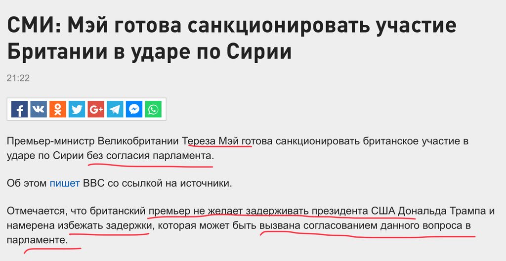 Премьер-министр Великобритании Тереза Мэй отдала приказ направить британские подлодки на расстояние ракетного удара по Сирии. Об этом пишет The Daily Telegraph. Отмечается, что удар по территории Сирии может быть нанесён в четверг, 12 апреля. По данным издания, Мэй также созвала срочное совещание кабинета, прервав пасхальные каникулы министров. https://russian.rt.com/world/news/502279-sm...t.co/LzmZbswo6O Дебилы, блять. -------------------- «В горячем споре равно жалко