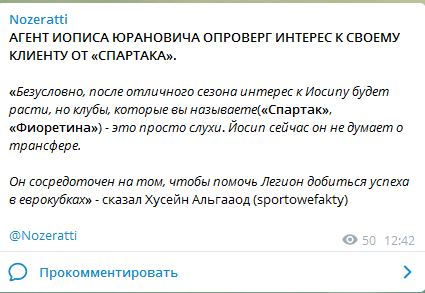 Источник: "Спартак" интересуется правым защитником сборной Хорватии По данным источника, "Спартак" может проявлять интерес к правому защитнику сборной Хорватии и варшавской "Легии" Йосипу Юрановичу. В агентских кругах появилась информация об интересе московского "Спартака" к правому защитнику польской "Легии" Йосипу Юрановичу, выступавшему на Чемпионате Европы-2020 в составе сборной Хорватии, сообщает телеграм-канал журналиста Максима Алланазарова. В прошедшем сезоне 25-летний игрок провел за варшавскую "Легию" 32 матча во всех турнирах, забил 1 гол и отдал 8 результативных передач. На счету Юрановича есть 10 матчей за сборную Хорватии, в том числе 2 на Евро-2020, где он провел полный матч на групповом этапе против Шотландии (3:1), а также вышел в стартовом составе и сыграл 74 минуты против Испании в игре 1/8 финала (3:5 д. В.)