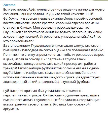 Глушенков может уйти из «Спартака». Витория не рассчитывает на него https://www.sports.ru/football/1099091315-g...et-na-nego.html Полузащитник Максим Глушенков, вероятно, покинет «Спартак». Как утверждает «Спорт-Экспресс», новый главный тренер красно-белых Руй Витория не заинтересован в 21-летнем россиянине и не видит его игроком команды. Интерес к хавбеку проявляют «Химки». Часть минувшего сезона Глушенков провел в подмосковном клубе на правах аренды. За «Химки» он провел 6 матчей в РПЛ и забил 2 гола. Сомнительный слух. Игнатов, Бакаев, Глушенков - игроки под комбинационный футбол. места всем не хватит, а на скамейке сидеть тоже не каждый захочет В любом клубе придется бороться за место в основе. Если не готов к этому, лучше с футболом завязывать. -------------------- За Спартак с 1973 года!