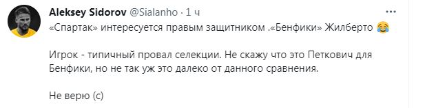 Директор «Спартака» по развитию и коммуникациям Антон Фетисов прокомментировал информацию о переговорах с защитником «Бенфики» Жилберту. «До совершения сделки клуб не намерен комментировать слухи. Вместе с тем, Жилберту — качественный футболист, способный усилить многие команды», — сказал Фетисов в беседе с корреспондентом «Чемпионата» Максимом Пахомовым. Sport24 сообщал, что «Спартак» интересуется правым защитником «Бенфики» Жилберту. В услугах Жилберту также заинтересованы клубы из Европы и Бразилии. Жилберту перешёл в «Бенфику» из «Флуминенсе» год назад, подписав контракт на пять лет. 28-летний футболист в прошедшем сезоне Примейры провёл в составе «Бенфики» 25 матчей и отдал одну результативную передачу. https://www.championat.com/football/news-44...ource=copypaste Похоже и правда интересуются. -------------------- Спартак, ты никогда не будешь один!