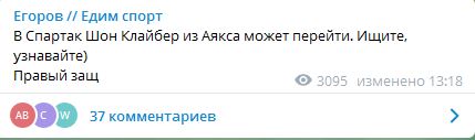 «Спартак» не интересуется Сеаном Клайбером», — сказал пресс-атташе московского клуба Ярослав Кулёмин в беседе с корреспондентом «Чемпионата» Салаватом Муртазиным. |