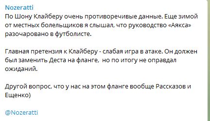 В «Спартаке» опровергли информацию об интересе к крайнему защитнику «Аякса» Сеану Клайберу. Ранее о наличии интереса к футболисту со стороны красно-белых сообщил журналист Sport24 Дмитрий Егоров.
