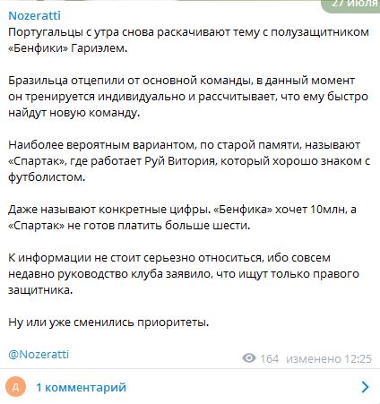 Приоритеты сменились. Коля оказался отличным защитником, а вот полузащита вызывает опасения. ) Пресс-атташе «Спартака» Ярослав Кулемин в разговоре с «СЭ» опроверг информацию об интересе к бразильскому полузащитнику «Бенфики» Габриэлю. https://www.sport-express.ru/football/rfpl/...enfiki-1816685/ «К нам уже весь состав «Бенфики» на словах отправили. Нет, Габриэлем не интересуемся», — сказал Кулемин «СЭ». Ранее об интересе красно-белых к 27-летнему футболисту сообщило издание A Bola. |
