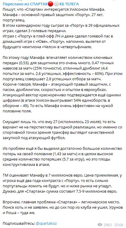 Пресс-атташе «Спартака» Ярослав Кулемин в интервью журналисту для Eurostavka отреагировал на информацию «СЭ» об интересе клуба к защитнику «Порту» Вилсону Манафе.