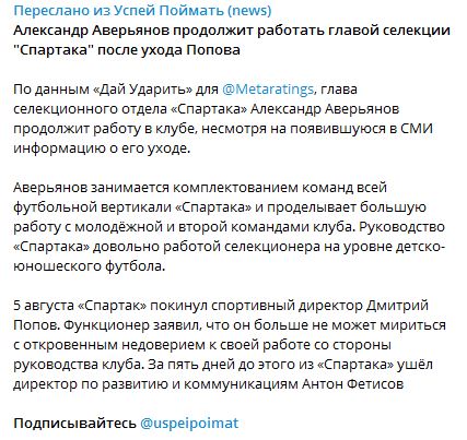 .36K subscribers Channel created August 4 Дмитрий Попов 📰 Андрей Федун: «Попов уходит из „Спартака“? Выпил, наверное» / «Это не мужской поступок!» Леонид Федун — об уходе Дмитрия Попова Член совета директоров «Спартака» Андрей Федун отреагировал на новость о том, что спортивный директор красно-белых Дмитрий Попов принял решение покинуть команду. Заявление он должен написать в четверг, 5 августа. «Попов уходит? Выпил, наверное. Я его заявления не слышал. Что касается ответной игры, то шансы есть всегда. Могут выйти, а могут и не выйти», — передает слова Федуна корреспондент Sport24 Александр Сергеев. Попов был назначен на пост спортивного директора красно-белых 26 ноября 2020 года. Он уже занимал эту должность с сентября 2008 года до августа 2016-го. ************* 📰 «Это не мужской поступок!» Леонид Федун — об уходе Дмитрия Попова Владелец «Спартака» Леонид Федун прокомментировал заявление спортивного директора Дмитрия Попова об уходе из клуба. «Это не мужской поступок — бежать после поражений. Из-за того, что тебе не утвердили ту кандидатуру, которая вызывает сомнения для покупки. Это не мужской поступок! Все, что могу сказать. К сожалению, у Попова уже подобная ситуация была. Ну ладно, Бог с ним», — сказал Федун. 3.4Kviews 22:46 Дмитрий Попов Не кажется ли людям странным, что у «семьи» никак не клеится со спортивными директорами? За последние три года «ушел» Цорн, Газизов, теперь вот и я. Причем, заметьте, все и каждый выставляются плохими переговорщиками, бездарными рвачами, а то и просто намекают на алкоголизм. Заремочка - яркая личность, безусловно. Но за своим эго она уже не видит и не слышит того, что действительно важно. Именно из-за него она неспособна принимать взвешенные решения характерные для руководителя. Все ведь помнят, как «профессионально» она себя повела, когда была утверждена позиция Руя Виктории. К нам приехал отличный профессионал, европейский тренер, умеющий ставить игру, но в первые же дни после назанчения запустился маховик PR-департамента и карманных СМИ Заремы. Она не унималась даже после предсезонного Пари-Матча, где Спартак катком прошелся по соперникам. Новый тренер поставил игру за один сбор, воскресил Бакаева, Игнатова, Рассказов одним из лучших был. Появилась атакующая проспартаковская мысль, а не бесконечные скачки на бровке. Согласовали с тренером одного из лучших ПЗ Южной Америки, но снова вмешалось неуёмное и ядовитое эго. Участвовать в этом нет никакого желания. Желаю всем причастным к происходящему в Спартаке любить Спартак в себе, а не себя в Спартаке. Правда, слабо в верится в такую возможность, ведь в руководство уже рвётся внебрачная дочь и "дядя" Камоцци. Чуть позже поговорим о мужских поступках. P.S: И ещё. Нет, я не пью 3.7Kviewsedited 23:12 Дмитрий Попов Я бы не разделял поступки на мужские, женские, миллиардерские и даже, прости Господи, «куртизанские». Человек может поступать лишь по-людски или по-свински. Уморительно то, как «семья» тычит меня в тряпку, как котенка, подписанием Хендрикса. Да, это не самый сильный опорник из wish-листа на вход, но посмотрите на его цифры вчера и сравните с разобранным после неудачи на ЕВРО Ромой Зобниным. Играет вперед лучше Крала, который тоже форсировал подготовку к сезону из-за ЧЕ. Наконец, Хендрикс - европеец из конкурентной среды топ чемпионатов, о чем так ратует наша генеральша. По-людски ли обходится со мной 