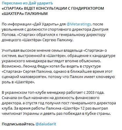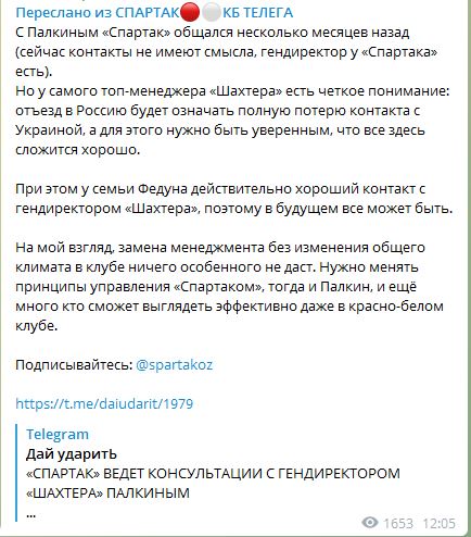 Если есть словосочетание "семья Федуна" в новости, то скоро мы узнаем о Палкине, как о жадном и непрофессиональном жидобандеровце, который так и не написал стратегию, просрал селекцию, спился и вообще, он, возможно, шпион))) Не пойдет Палкин. Делать ему здесь нечего.Смотря какой контракт Федун предложит. Бабло побеждает зло. А вариант наверное самый лучший из возможных. -------------------- За Спартак с 1973 года!