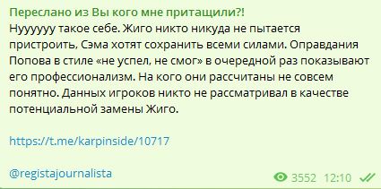 Ок Попова нет уже месяц, где правый защитник, где замена Жиго или его переподписание? Урунова отдать в бесплатную аренду, такое себе достижение. Так Зарема на отдыхе)) Сейчас в сентябре вернется - и с новыми силами...)) З.ы. Тедеско например, не смогли переподписать по тем же причинам. Причем до Попова. Может дело не совсем в нем?)) -------------------- Видел, слышал, читал...