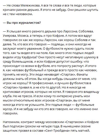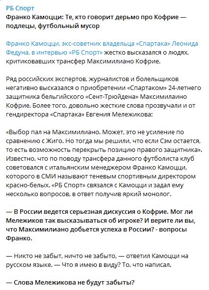 Камоцци: «То, что они делают против Кофрие, — это подло, мелочно и позорно» https://bobsoccer.ru/user/39208/blog/kamocc...-i-pozorno.html Бывший советник и консультант владельца «Спартака» Леонида Федуна Франко Камоцци прокомментировал «СЭ» слова генерального директора клуба Евгения Мележикова о новичке красно-белых Максимилиано Кофрие. Мележиков заявил, что трансфер бельгийца может быть ошибкой. «То, что они делают против Кофрие, — это подло, мелочно и позорно. Я никогда за всю свою карьеру не видел такой атаки на кого-то, кто еще ни разу не играл в «Спартаке». Я с удовольствием дождусь всех этих специалистов в конце сезона. Затем мы увидим, кто дал хороший отзыв о нем, как я, а кто просто выкрикивает чушь», — сказал Камоцци «СЭ». Вот это по фактам. Игрока засрали до того, как он провёл первый матч, это ублюдочно. -------------------- Поверь в Спартак!