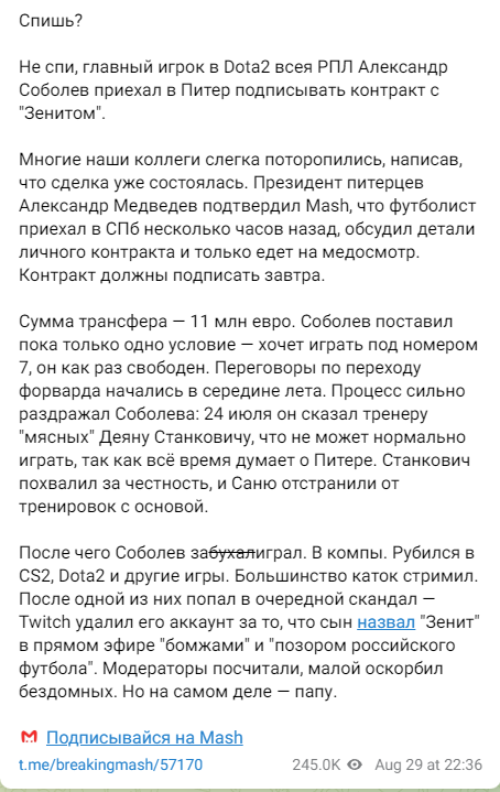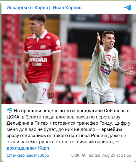 Нападающий московского "Спартака" Александр Соболев прилетел в Санкт-Петербург для прохождения углубленного медобследования перед переходом в "Зенит". Об этом ТАСС сообщил председатель правления "Зенита" Александр Медведев. "Соболев приехал в Санкт-Петербург и проходит углубленное медицинское обследование", - сказал Медведев. Ранее "Спорт-Экспресс" сообщил, что Соболев в случае удачного прохождения медобследования подпишет контракт с "Зенитом" на четыре года с возможностью продления на один сезон. На данный момент игрок отстранен от тренировок со "Спартаком". https://tass.ru/sport/21722641 -------------------- Спартак, ты никогда не будешь один!