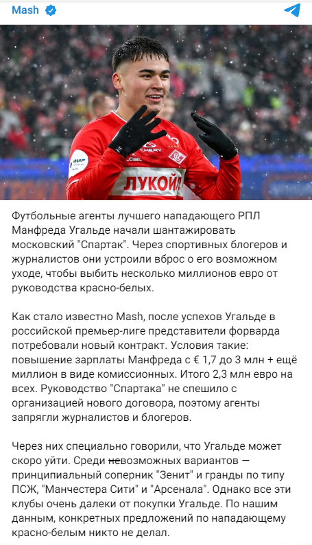 Переговоры с Манфредом Угальде о продлении контракта со «Спартаком» действительно идут, но цифры, о которых пишет Мэш, не верные.