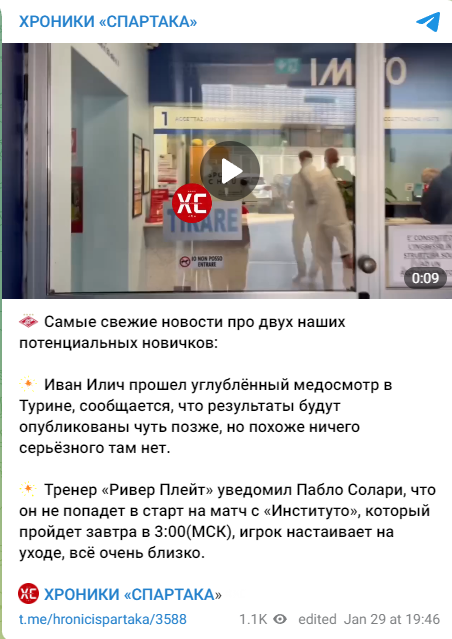 Итальянский журналист изданий Corriere Torino и Toro news Альберто Джулини ответил на вопрос «СЭ» о состоянии здоровья потенциального новичка «Спартака», полузащитника «Торино» Ивана Илича. «Илич сегодня пройдет дополнительное обследование. Только что он прибыл в медицинский центр», — сказал Джулини «СЭ». 14 января спортивный директор «Торино» Давиде Ваньяти сообщил «СЭ», что Илич выбыл на срок около 2 недель из-за травмы. https://m.sport-express.ru/football/italy/n...travmy-2294861/ -------------------- Спартак, ты никогда не будешь один!