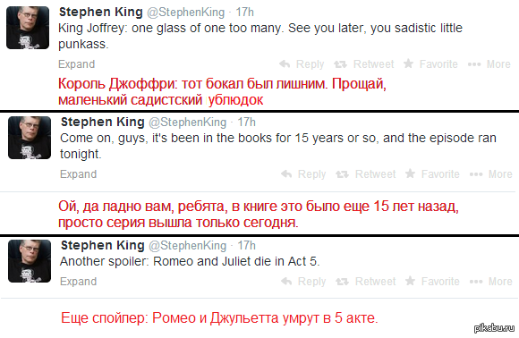 А в ИП наконец-то случилось событие, которого ждали все фанаты сериала Да, и благодаря спойлерастам в интернетах добрая половина фанатов узнала об этом до просмотра второй серии)) Я об этом узнал вообще еще до начала сезона, причем задолго Я книг не читал, мои тут мне на день варенья собираются всю пенталогию подарить. И интернетов по этому поводу не читал специально, дабы свежесть восприятия не притупить. Но сериал смотрел весь, и должен сказать, что Мартин - это тролль 90 уровня и яркий представитель социалистического реализма. По крайней мере и с казни Неда Старка, и с Красной свадьбы, и с прочего секса и насилия мы с женой охуели до остолбенения, вот такой он: старый добрый феодализм, хе-хе...))))))) И теперь да, свершилось, хотя я и раньше предполагал, что такой наглухо ебанутый результат инцеста, как Джоффри, долго не проживёт. Вопрос только в том, что же его траванул (просьба к тем, кто читал и в интернетах подсмотрел НЕ ПИЗДЕТЬ ТУТ НИЧЕГО ПО ЭТОМУ ПОВОДУ!!!), мы с супругой сделали ставки, она на бабулю Тирелл, я на Сансу. Ну, и ещё интересно, кто именно возродит дом Старков: Арья, Бран, или Джон Сноу. А также кто кого замочит: Сенсея Тириона, или он её, и кто из них выпилит собственного папашку, а то уж больно успешно до сих пор у Ланнистеров всё обстояло. -------------------- Vox populi-vox Dei